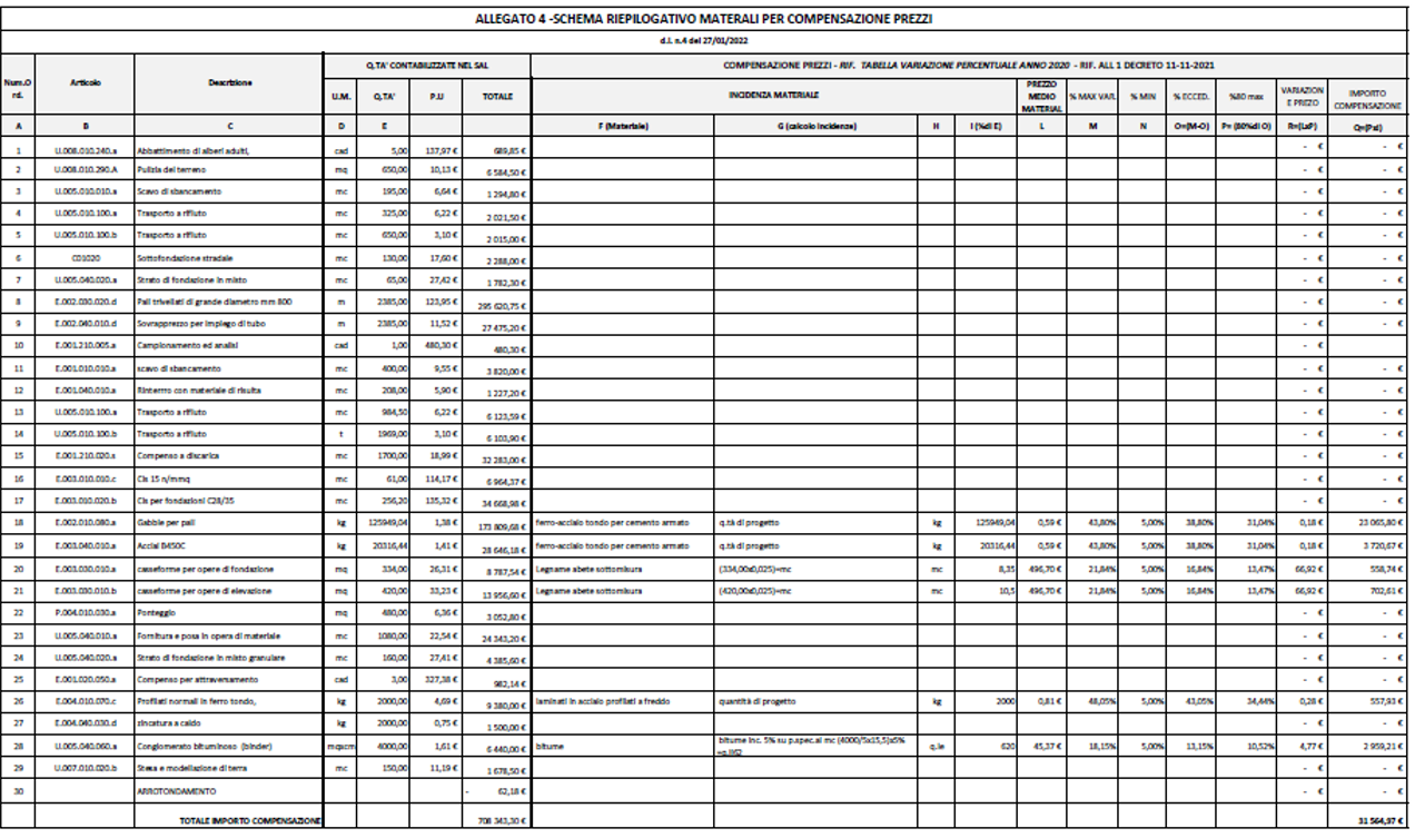In prima battuta è stato valutato l’effettivo aumento dei costi dei materiali prendendosi a riferimento i preventivi originali (giustificati in sede di gara) e quelli aggiornati all’attualità per un maggior costo diretto di circa 72.013,74 (pari al 10% dell’appalto) euro come da prospetto che segue: